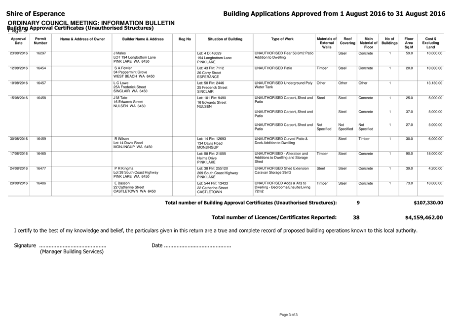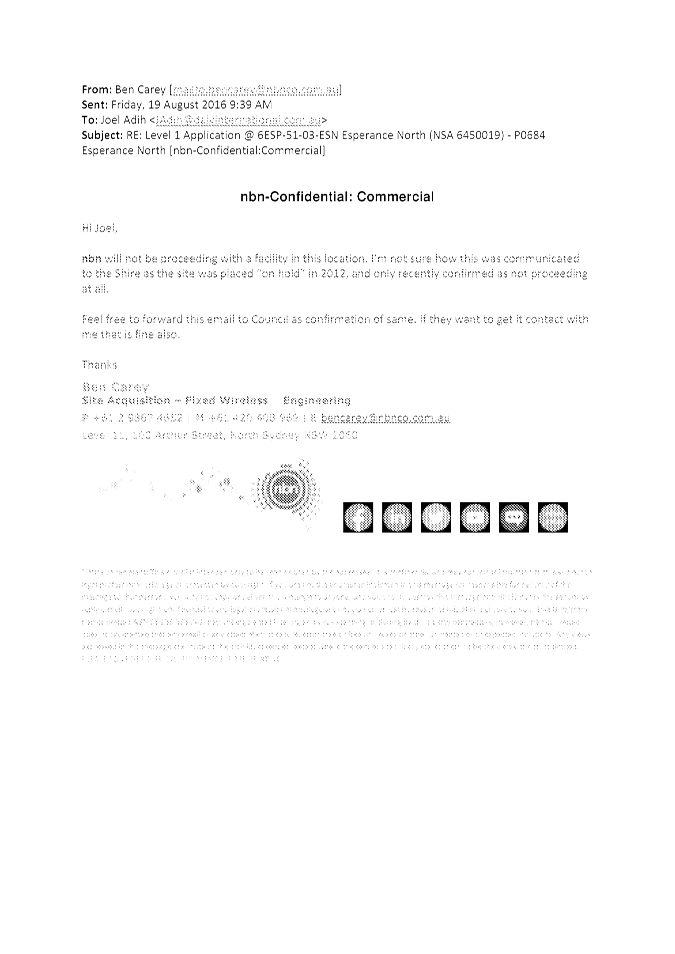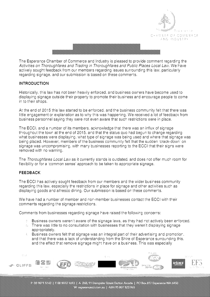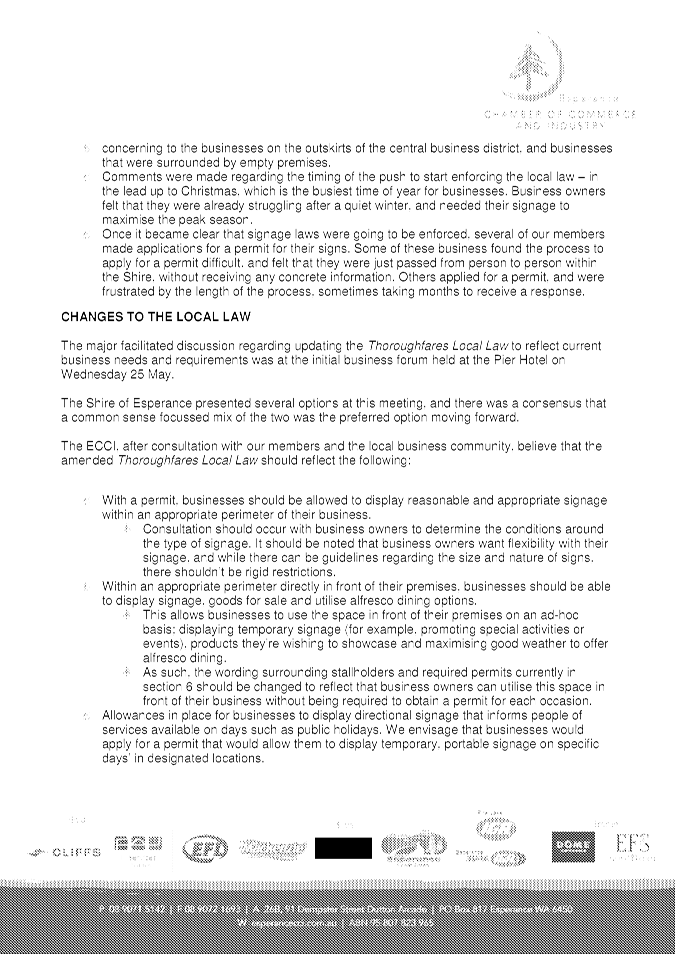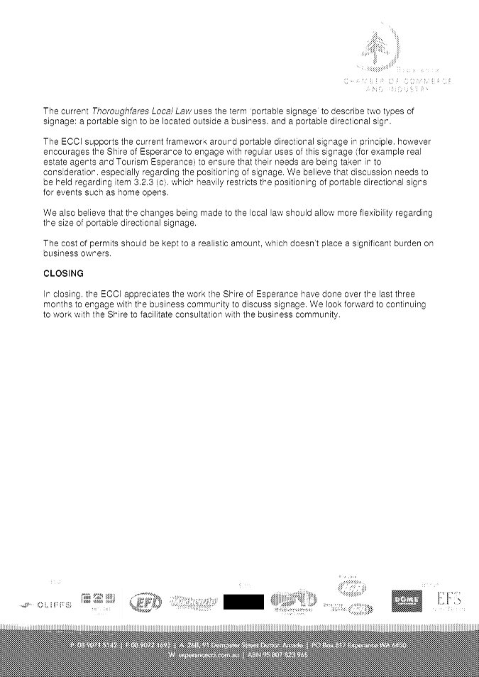 In particular and without derogating in any way from the broad disclaimer above, in any discussion regarding any planning application or application for a licence, any statement or intimation of approval made by a member or officer of the Shire of Esperance during the course of any meeting is not intended to be and is not to be taken as notice of approval from the Shire of Esperance. The Shire of Esperance warns that anyone who has any application lodged with the Shire of Esperance must obtain and should only rely on written confirmation of the outcome of the application, and any conditions attaching to the decision made by the Shire of Esperance in respect of the application.