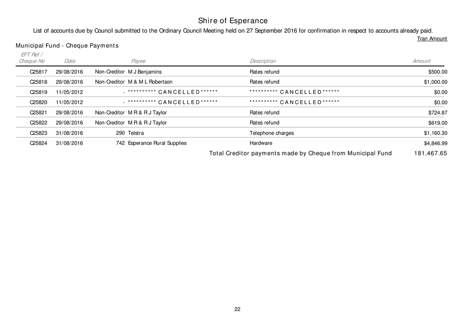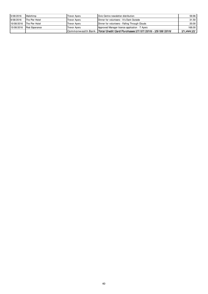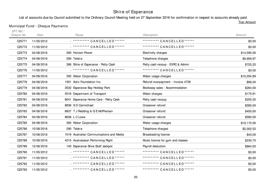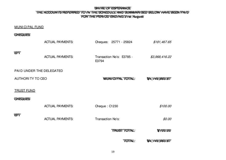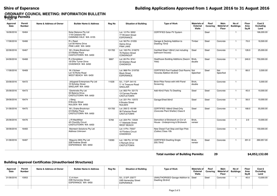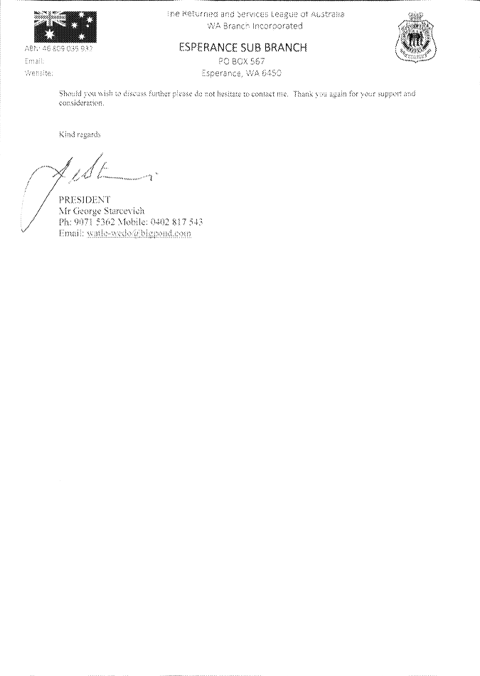 In particular and without derogating in any way from the broad disclaimer above, in any discussion regarding any planning application or application for a licence, any statement or intimation of approval made by a member or officer of the Shire of Esperance during the course of any meeting is not intended to be and is not to be taken as notice of approval from the Shire of Esperance. The Shire of Esperance warns that anyone who has any application lodged with the Shire of Esperance must obtain and should only rely on written confirmation of the outcome of the application, and any conditions attaching to the decision made by the Shire of Esperance in respect of the application.