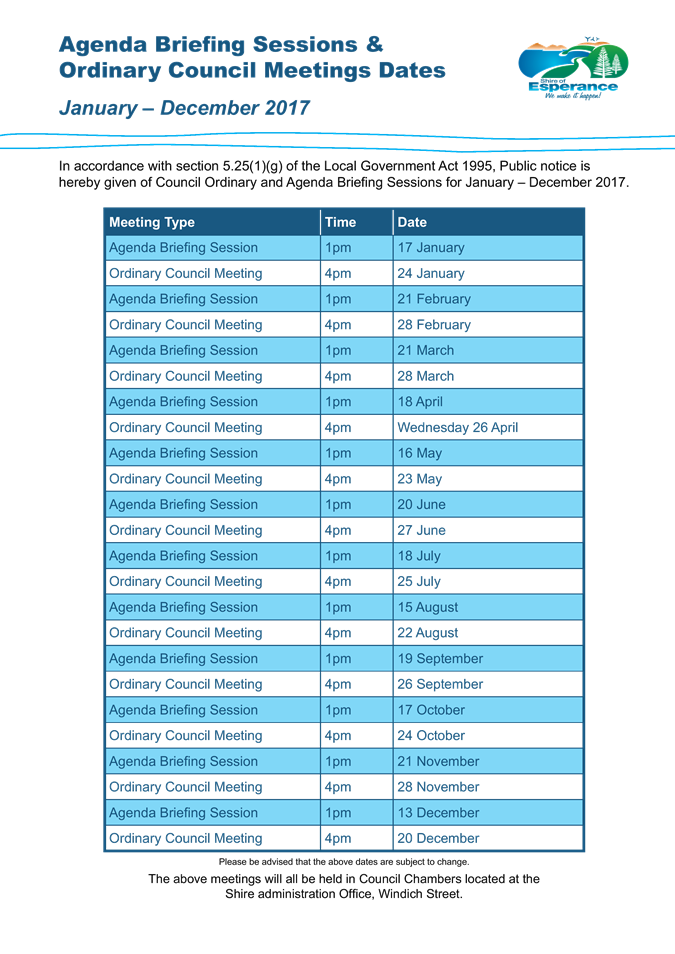 Under Section 5.25(1)(g) of the Local Government Act 1995 and 12(1) of the Local Government regulations 1996 Council must give public notice of the date and agenda for Council meetings.
