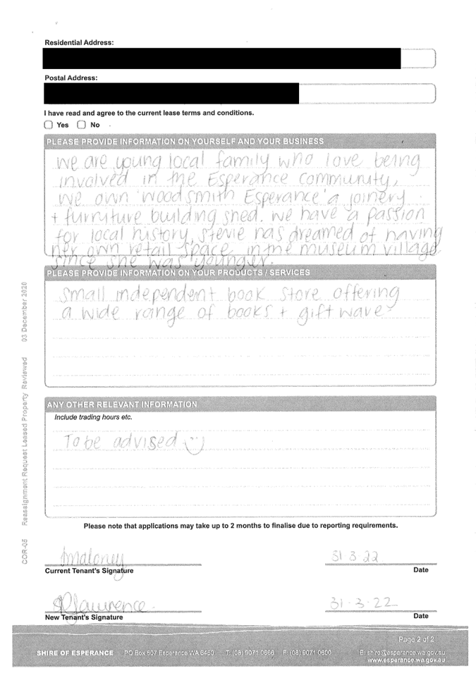 Tammy Maloney started leasing the premises in May 2020 for the operation of her business ‘The Book Box’. In March 2022, Ms Maloney advised that she has sold her business, and wishes to reassign the lease for the Old Court House over to the new owner of the business, Stevie Lawrence.