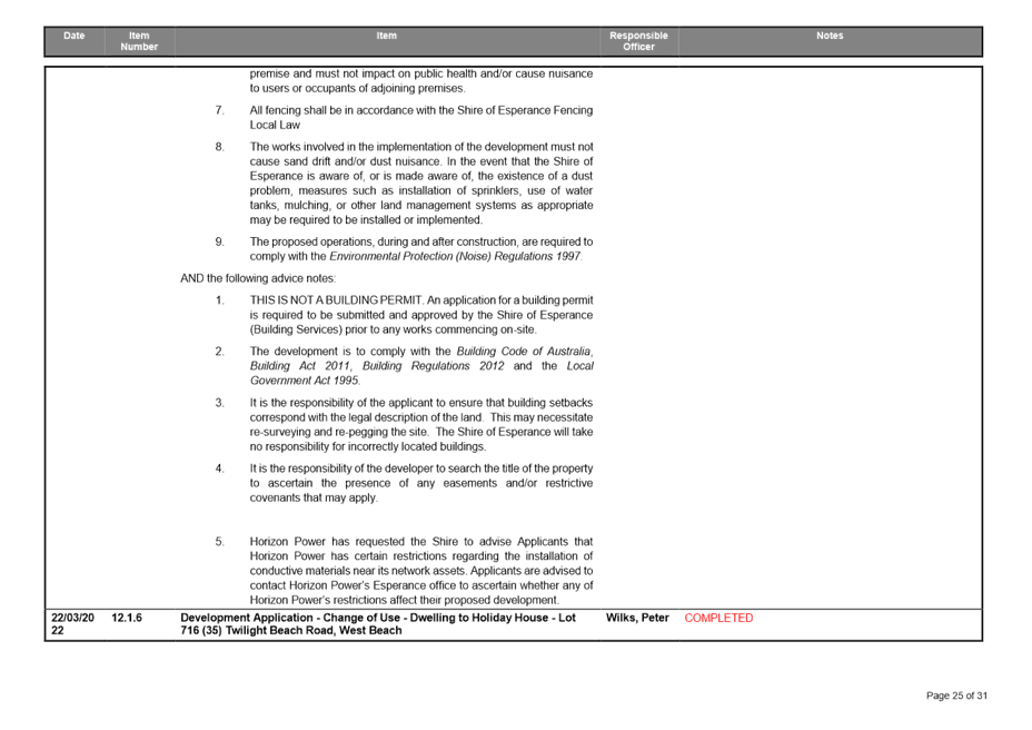 In particular and without derogating in any way from the broad disclaimer above, in any discussion regarding any planning application or application for a licence, any statement or intimation of approval made by a member or officer of the Shire of Esperance during the course of any meeting is not intended to be and is not to be taken as notice of approval from the Shire of Esperance. The Shire of Esperance warns that anyone who has any application lodged with the Shire of Esperance must obtain and should only rely on written confirmation of the outcome of the application, and any conditions attaching to the decision made by the Shire of Esperance in respect of the application.